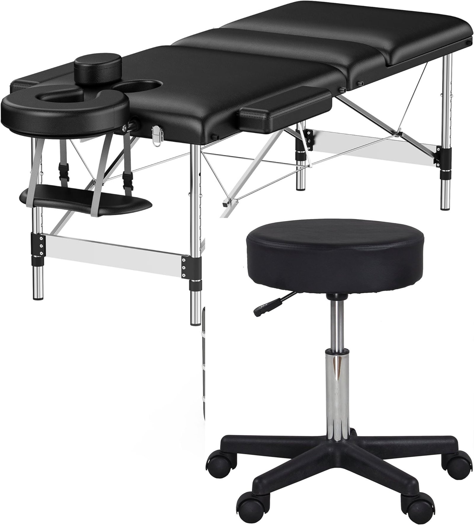 3 Zones 70 cm Upgrade Width, Height-Adjustable Aluminium Foldable Massage Table/bed with Black Adjustable Rolling Massage Cushion Hydraulic Salon Stool, 5 Wheels